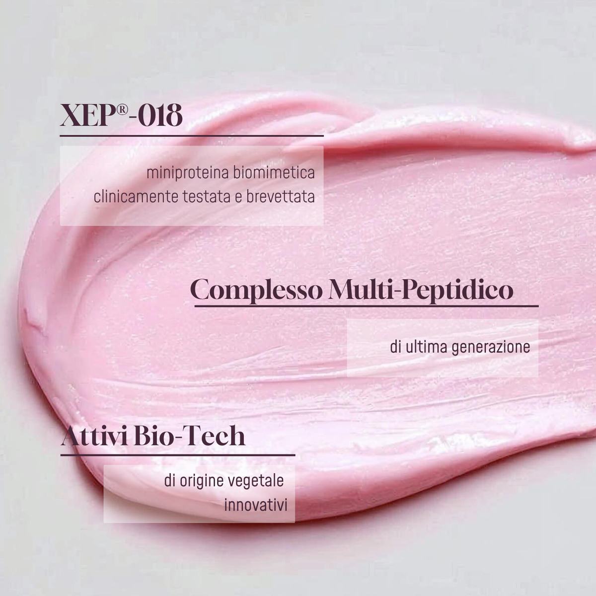 XEP®-018 è una Miniproteina biomimetica ispirata al veleno della lumaca marina Conus consors, composta da 22 amminoacidi a basso peso molecolare, sufficientemente piccola da attraversare gli strati superficiali della pelle, mantenendo affinità e specificità verso i recettori cutanei, per un’azione cosmetica mirata e selettiva.